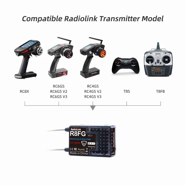 - Real-time Telemetry:Â Radiolink R8FG RC Receiver telemetry feature can provide real-time vital information like the vehicle’s battery voltage, RSSI signal and more, avoiding battery over-discharge and damage.